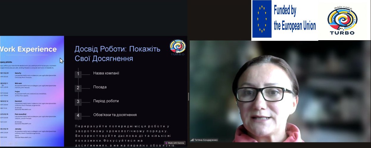 Тетяна Бондаренко провела лекцію на тему «ЕФЕКТИВНЕ РЕЗЮМЕ – КРОК ДО УСПІШНОГО ПРАЦЕВЛАШТУВАННЯ», в рамках якої розглянула такі питання: Ефективне Резюме у EUROPASS, як справити позитивне перше враження, показати сильні сторони пошукача роботи. Чітке, структуроване й професійно оформлене резюме відкриває двері до співбесіди та дає шанс проявити себе.