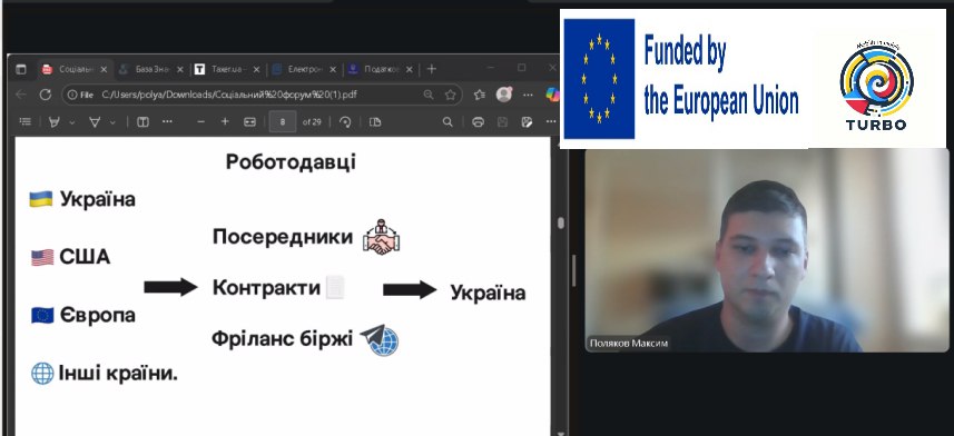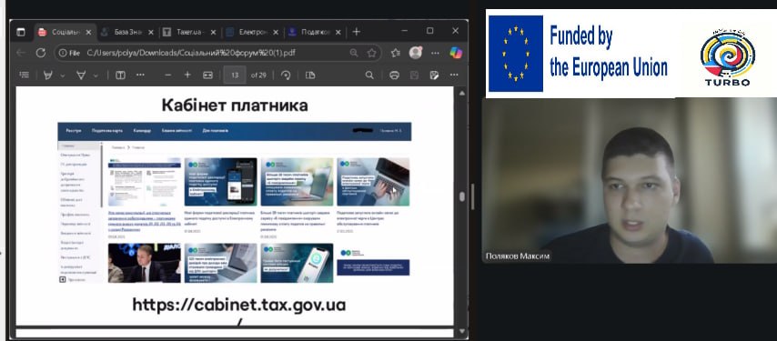 Презентацію на тему «СПОСОБИ ВЕДЕННЯ КОМЕРЦІЙНОЇ ДІЯЛЬНОСТІ В ГАЛУЗІ ІТ» провів фахівець в галузі IT, розробник програмного забезпечення та досвідчений підприємець Максим ПОЛЯКОВ. Спікер розглянув такі питання, як Способи ведення комерційної діяльності POV, Як влаштований в цілому процес співпраці в IT, Податки (Порівняння полів декларації по ФОП в кабінеті платника з ДІЯ), Кар’єрні перспективи та можливості працевлаштування.